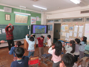 1,2年生は、5時間目、英語の授業でした。香取市在住の文京学院大学椿まゆみ教授が来校し、今日を含め、4回、授業をしてくださいます。椿先生によると、英語の知識がなくても、英語を聴いたり、英語に合わせて体を動かして感じることが大切とのことでした。「アリとキリギリス」の話を聴き、お話についての質問に答えたり、歌を歌ったりしながら楽しく英語の学習ができました。みんなで声をそろえて歌うところは、とても盛り上がりました。1年生は、椿先生の授業は、はじめてでしたが、「英語を聞きながらお話の意味を考えたのが楽しかった。」と話してくれました。椿先生は、「ほとんど日本語を話さなかったのに、よく分かって、反応がよかったです。とても楽しく学習できました。」と感心されていました。