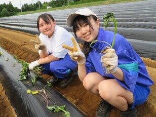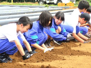5月30日(木)1年生による芋苗植えを、古原地区の畑(元PTA役員の石井さんから提供していただいています。)で行いました。生徒たちは、協力して手際よく苗を植えることができました。自分たちでも1本の畝をつくり、マルチシートを張りました。10月には香取特別支援学校の生徒たちと協同での芋掘り会を予定しています。芋の出来栄えがとても楽しみです。